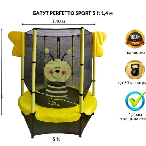 Детский батут с защитной сеткой "Perfetto sport 5" - компактный и удобный батут для малышей. Уникальность его в том что он универсален! Летом вы можете установить его на газоне на даче, а зимой его легко можно забрать с собой в квартиру, так как он очень легко собирается и разбирается, он не займет много места при перевозке в автомобиле. Наш батут оборудован защитной сеткой и лазом застегивающимся на молнию. Внутри батут имеет мягкий мат, который надежно защищает ребенка от любых падений, а вертикальные стойки защищены мягкими чехлами