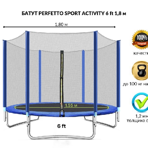 Батут с защитной сеткой "PERFETTO SPORT ACTIVITY 6"- это идеальный спортивный аттракцион для ваших детей. Наш батут оборудован защитной сеткой и лазом застегивающимся на молнию. Внутри батут имеет мягкий мат, который надежно защищает ребенка от любых падений, а вертикальные стойки защищены мягкими чехлами