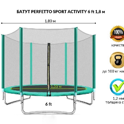 Батут с защитной сеткой "PERFETTO SPORT ACTIVITY 6"- это идеальный спортивный аттракцион для ваших детей. Наш батут оборудован защитной сеткой и лазом застегивающимся на молнию. Внутри батут имеет мягкий мат, который надежно защищает ребенка от любых падений, а вертикальные стойки защищены мягкими чехлами