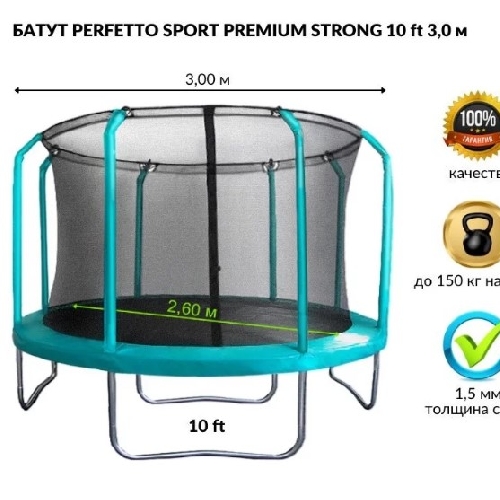Батут с защитной сеткой "Perfetto sport STRONG 10"- это идеальный спортивный аттракцион для ваших детей. Наш батут оборудован защитной сеткой и лазом застегивающимся на молнию. Внутри батут имеет мягкий мат, который надежно защищает ребенка от любых падений, а вертикальные стойки защищены мягкими чехлами