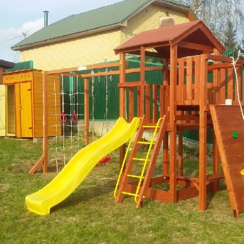 Конструкция выполнена из натуральных и экологичных материалов, все соединения надежно закреплены, а болтовые крепления закрыты пластиковыми заглушками. Это обеспечивает комфортную и безопасную игру на площадке.