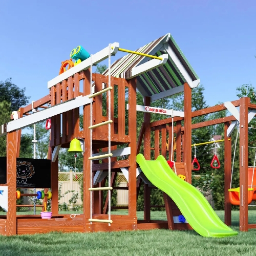 Это настоящая многофункциональная площадка, в которой есть всё: две платформы, спортивный модуль, песочница с ящиком для хранения, прилавок с подарочным набором, меловая доска, рукоход, гимнастические кольца, турники. Площадка продумана до мелочей и подойдёт для семьи с несколькими детьми или активного ребёнка с широкой фантазией.