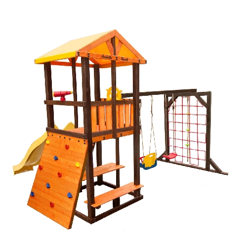 Комплектация: игровой домик, столик, лавочка - 2 шт, лестница, скат, ручка пластиковая - 2 шт, П-опция, качели "Лодочка", качели "Малыш", канат с зацепами, штурвал "Шторм", бинокль "Капитан", скалодром большой