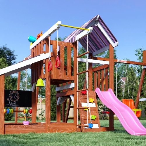 Эта модель — настоящий игровой городок, в котором ребёнок будет не просто играть, а расти активным, весёлым, самостоятельным. Горка, качели, спортивный блок, турник, гимнастические кольца, песочница, прилавок и меловая доска — здесь есть всё для развития тела, мышления и фантазии.