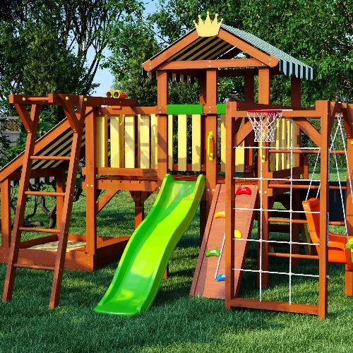 После энергичных игр дети смогут поиграть в песочнице под навесом или покачаться на удобных качелях "Люкс". Также в комплект входят: