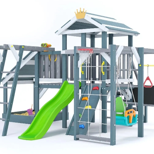 Компактная, но прочная игровая конструкция выдерживает высокие нагрузки. В домике с деревянной крышей можно играть, а пластиковая горка подойдет малышам. Удобная деревянная лестница с перилами обеспечивает легкий подъем.