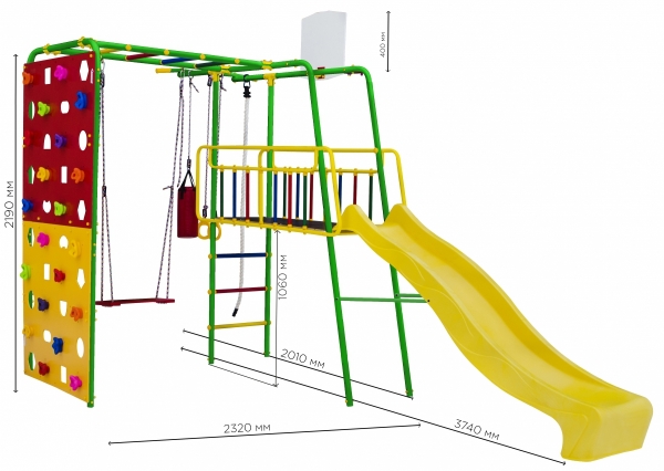 канат, гимнастические кольца, качели, баскетбольное кольцо, скалодром, боксерский мешок, горка