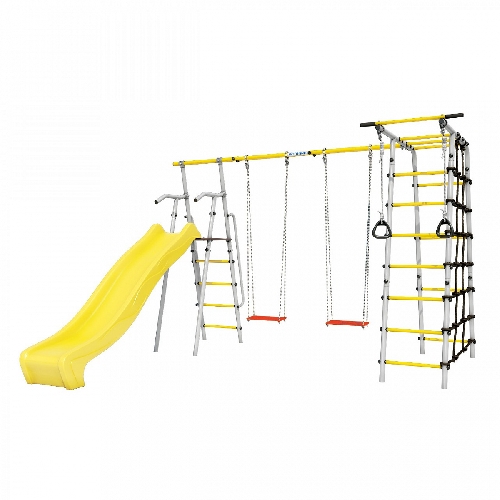 В комплект входят: горка, кольца, сетка лаза, гимнастическая лестница, рукоход и турник. Дополнить комплекс можно одинарными или парными качелями, а также подвесным диваном.