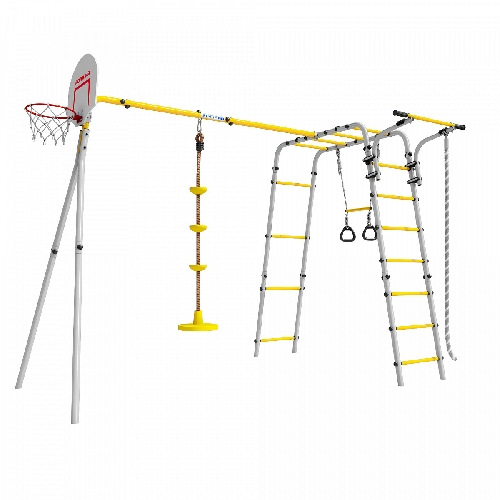 Рукоход, турник, канат для лазания и кольца с перекладиной, а также щит для игры в баскетбол — мы учли все любимые занятия маленьких непосед. Турник можно перемещать по вертикали, он закрепляется хомутами на любой высоте лестницы рукохода. Все оптимизируется под желание владельца. Навеска устойчива к атмосферному воздействию и в летнее время ее можно не заносить в дом после игр. В комплексе предусмотрены сразу двое качелей — дети не будут спорить за право покататься первым и могут веселиться вместе.