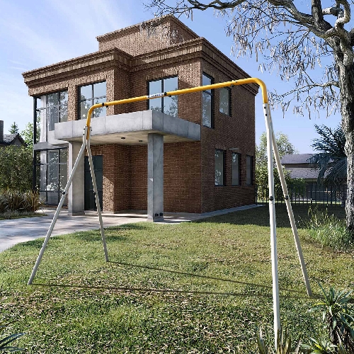 Каркас устанавливается методом бетонирования на площадку с ровным рельефом. Зона безопасности составляет 7550*4700мм. Изделие бетонируется на грунтозацепы на глубину 550мм. Необходимые крепежи для монтажа и грунтозацепы поставляются в комплекте. Установка навесного оборудования производится только после полного застывания бетона с высотой (от земли до сиденья качелей) не менее 350мм.