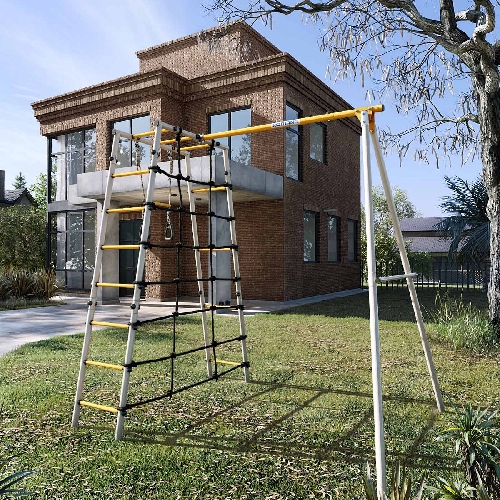 Стальной каркас комплекса повышенной прочности обеспечивает безопасные условия для занятий детей и взрослых. Допустимая нагрузка на гимнастическую лестницу составляет 100 кг. Детское навесное оборудование выдерживает до 50 кг.
