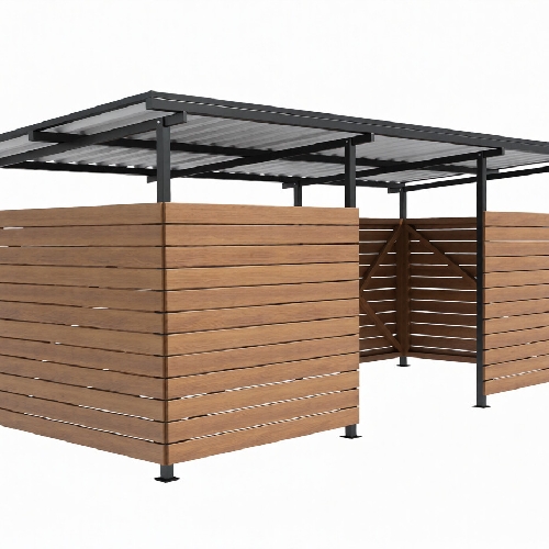 Для придания площадке более естественного и привлекательного вида, ее обшивают брусом из хвойных пород дерева. Древесина обрабатывается специальным составом, который защищает ее от влаги и ультрафиолета, сохраняя красоту на долгие годы. Вы можете выбрать один из трех благородных оттенков: палисандр, махагон или тик. А чтобы контейнеры были защищены от дождя и снега, площадка оснащена крышей из профлиста.