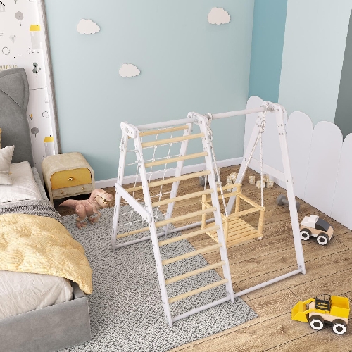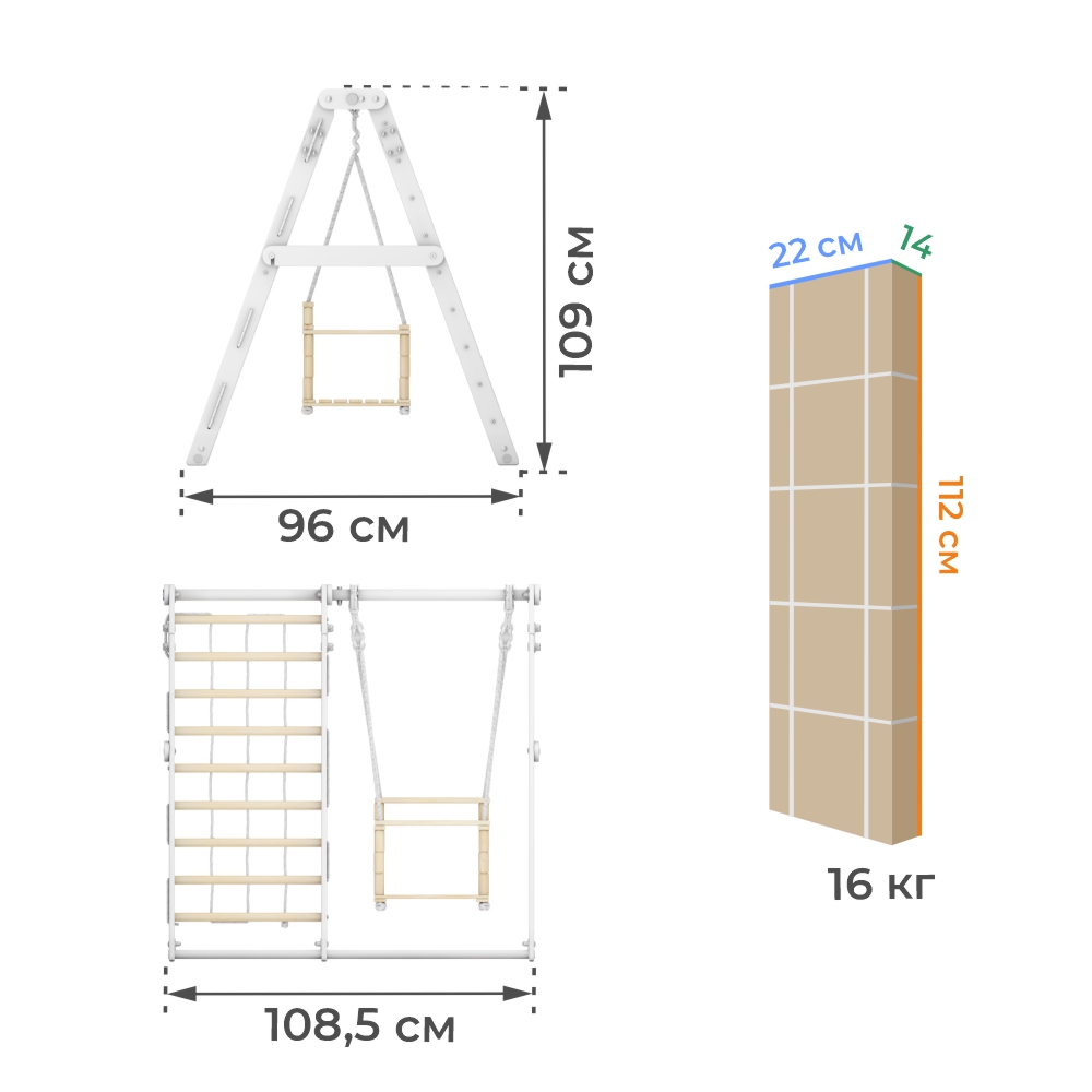 В комплекс входит гимнастическая лестница, сетка-лаз и качели с перекладиной для безопасности.