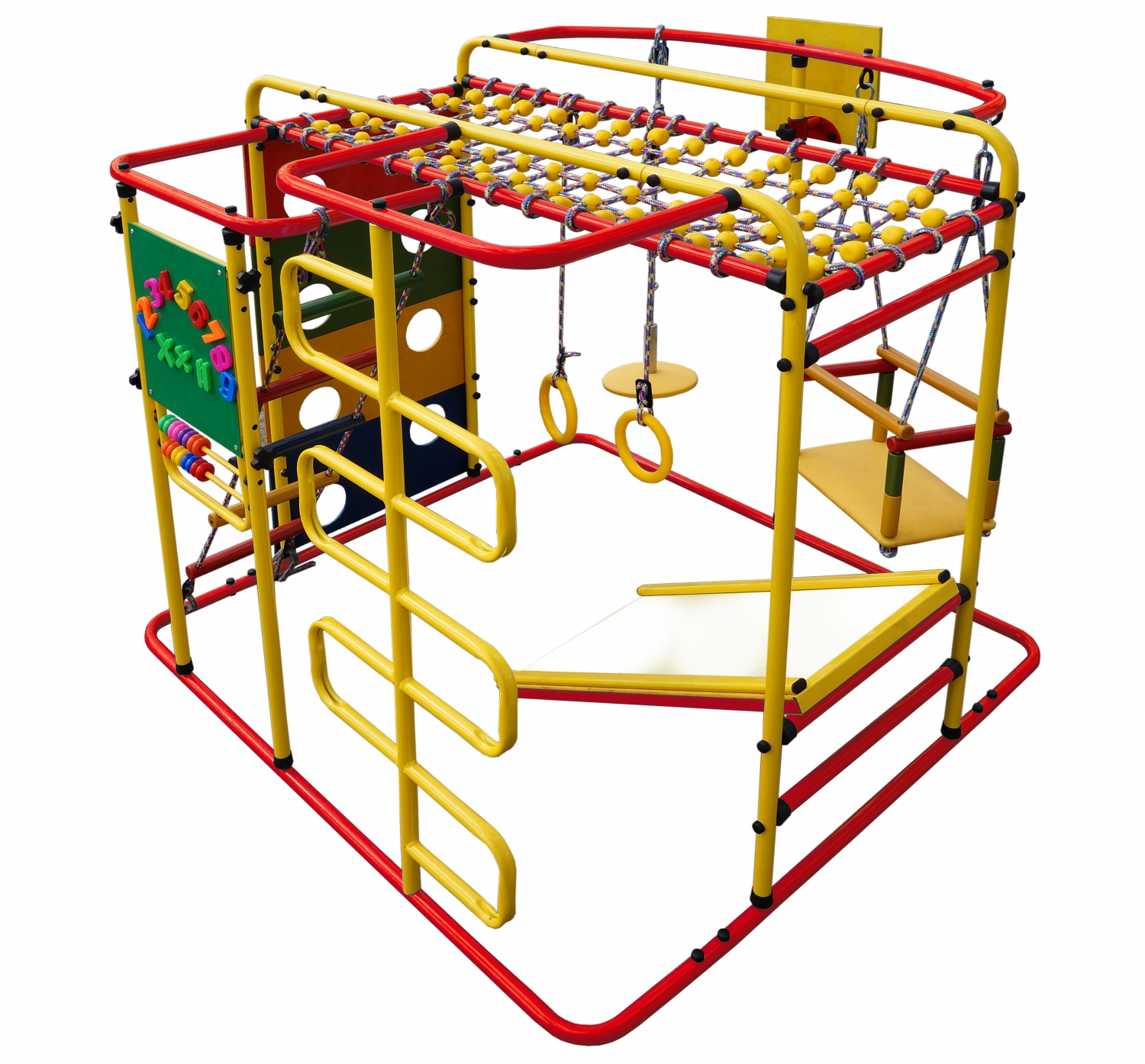 - Надежность и безопасность: Металлическая конструкция выдерживает до 100 кг, а навесное оборудование – до 80 кг. Все элементы продуманы до мелочей: защитные колпачки на болтах, заглушки на торцах, прочные веревки и нескользящее покрытие на лестнице.