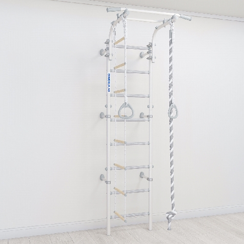 Детский спортивный комплекс ROMANA Next Pastel+ представляет собой обновленную версию популярной шведской стенки, выполненную в пастельных тонах белого и серого, что идеально подходит для современного интерьера.