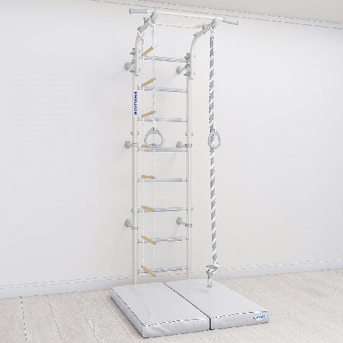 Для обеспечения безопасности во время занятий на шведской стенке, комплект снабжен компактным матом толщиной 100мм. Складная конструкция позволяет легко организовать его хранение, мат можно спрятать за комплекс после тренировок. Шведская стенка оснащена навесным оборудованием: гимнастическими кольцами, канатом, трапецией и турником с подвижной конструкцией.