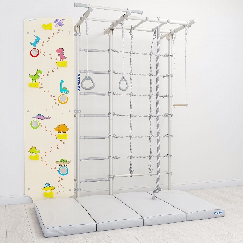 Шведская стенка оснащена разнообразным навесным оборудованием: канатом, кольцами, веревочным лазом, подвесом, рукоходом, турником и трапецией. Скалолаз функционально дополняет комплект. Занятия на спортивном комплексе развивают у ребенка силу, выносливость, ловкость, координацию и моторику.