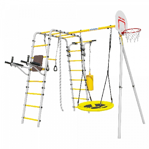 Функциональность комплекса обеспечивает множество дополнительных игровых элементов. В комплект входят: баскетбольный щит, груша, брусья, канат, кольца с перекладиной, гимнастическая лестница, рукоход, подвижный турник. Возможность регулировать турник по высоте позволяет подобрать комфортный уровень для ребенка. Комплект можно дополнить сеткой лазом и качелями разных видов. Множество элементов создают условия для всестороннего развития ребенка, занятия на комплексе развивают силу, ловкость, выносливость, координацию и моторику.