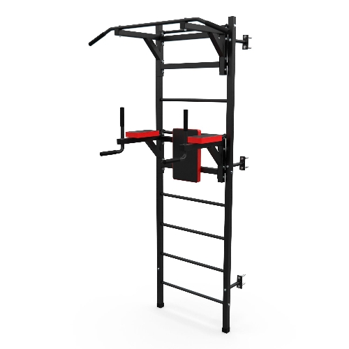 Турник длиной 99 см, оснащенный мягкими неопреновыми ручками, легко переставляется по высоте, позволяя адаптировать его под ваши нужды. Вынос турника от стены составляет 72 см. Брусья имеют вынос 87 см, а удобная спинка размером 42х25 см и толщиной 5 см, а также подлокотники 25х13х5 см, обеспечат комфорт во время выполнения упражнений. Поручни длиной 32 см и диаметром 25 мм изготовлены из стали толщиной 1,5 мм.