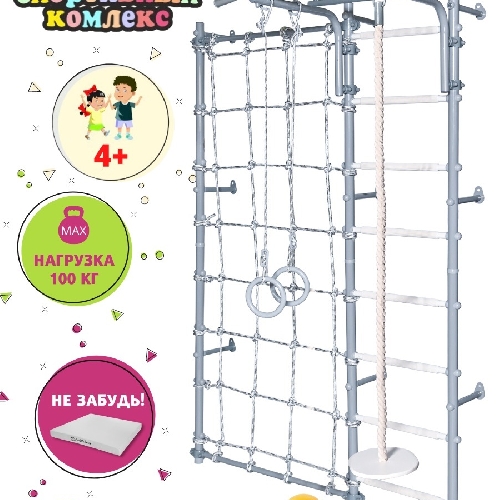 Комплектация: шведская стенка, турник, кольца гимнастические, лиана, стойка с сеткой