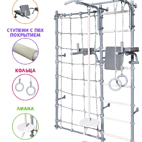 Комплектация: шведская стенка, турник, кольца гимнастические, лиана, стойка с сеткой, брусья откидные