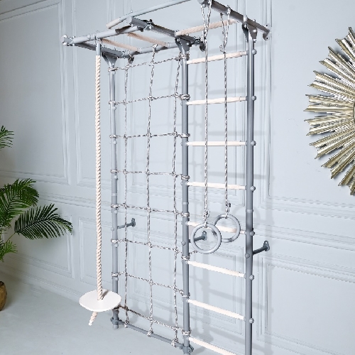 Комплектация: шведская стенка, турник, кольца гимнастические, лиана, рукоход, стойка с сеткой