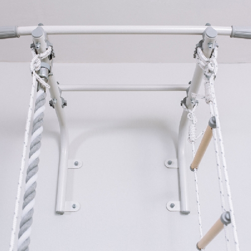 Благодаря металлическому каркасу и прочной настенной фиксации, турник устойчив и надежен. Конструкция выдерживает нагрузку до 100кг, это позволяет заниматься на турнике всей семье. Максимальный объем нагрузки на детское навесное оборудование составляет 50 кг.