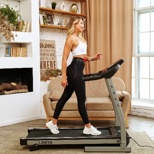 Электрическая беговая дорожка LAVITA для занятий дома. Тренажер начального уровня с мотором мощностью 1,75 л.с. Шаг изменения скорости беговой дорожки 0,1 км/ч.
