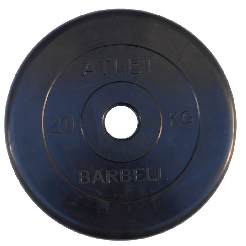 Диск: обрезиненный Цвет: черный Внутренний диаметр: 51 мм Втулка - резиновая. Вес диска 20 кг, Atlet