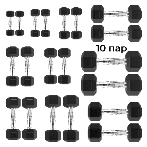 В комплект входят пары гантелей всех популярных весов, что позволяет постепенно увеличивать нагрузку и адаптировать тренировки под ваши индивидуальные потребности: